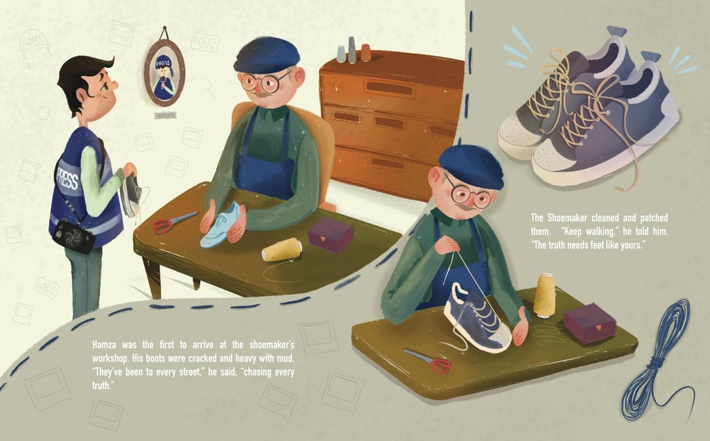As a writer, I jumped on the opportunity to connect with freelancers from Gaza via Taqat Careers, and upon asking for illustrators, I was given Afnan’s portfolio of work, which I absolutely adored. I asked Afnan if there was a story she wanted to tell, and she told me about an Arabic proverb she grew up hearing. Some version of the idea, “If you want to know about someone, look at their shoes.” And she shared how she has seen all kinds of shoes on the feet of her fellow Palestinians since the genocide began. So I told her I would write her story, she would illustrate it, and with your du’as, the world would read it. (And she wants to make it into an animation as well!)